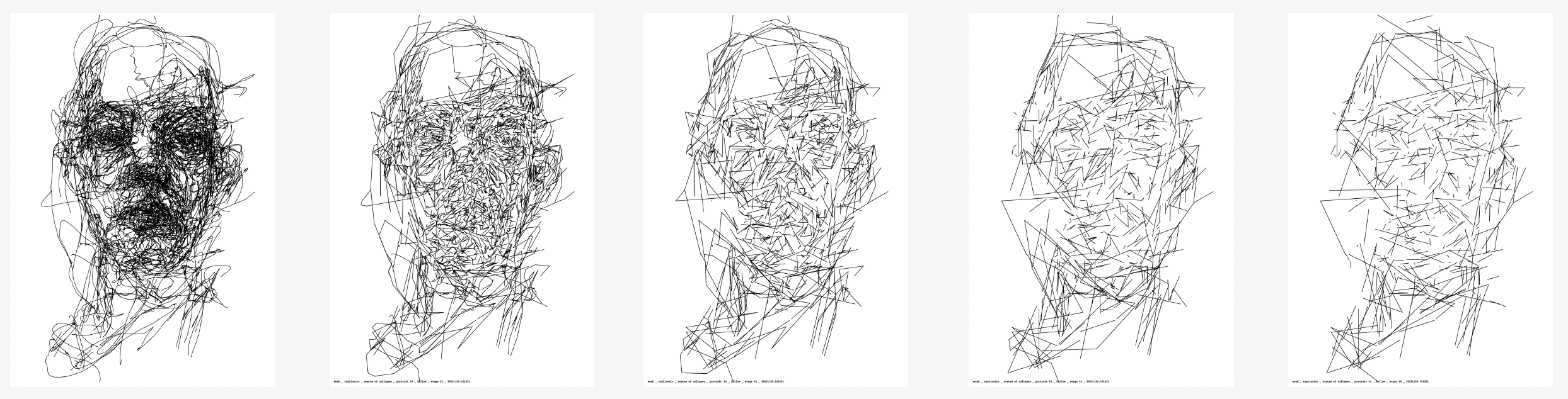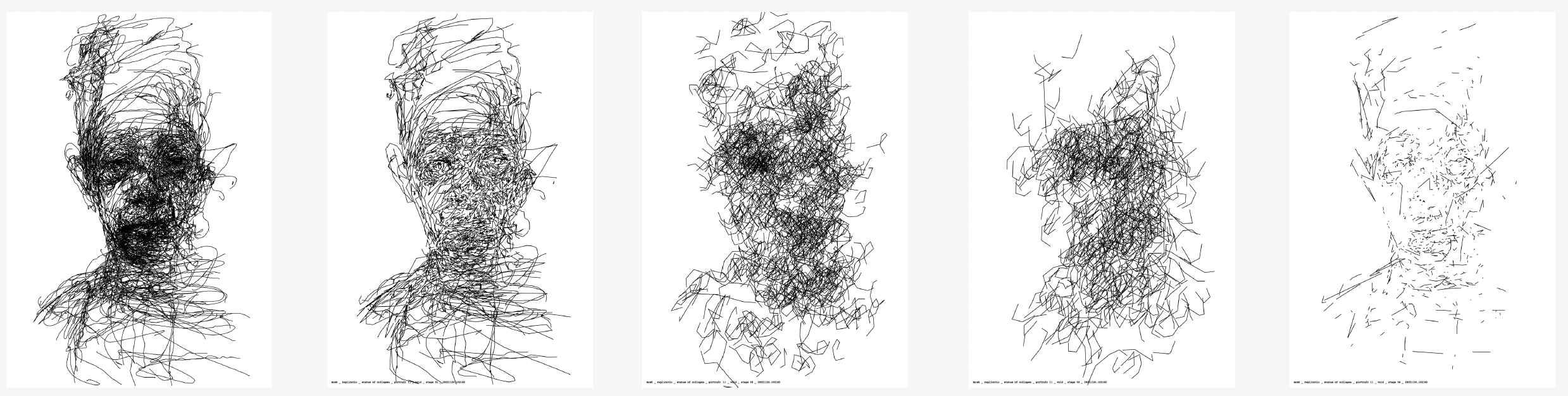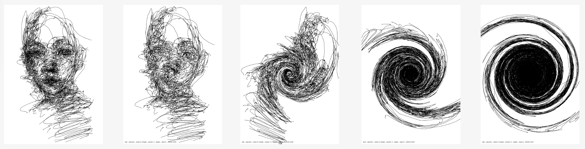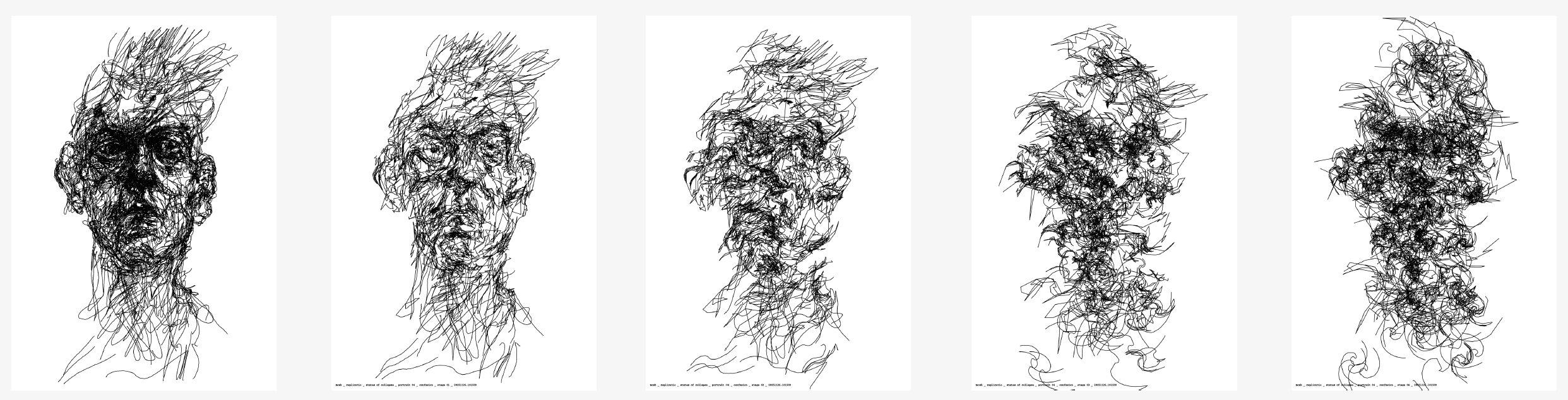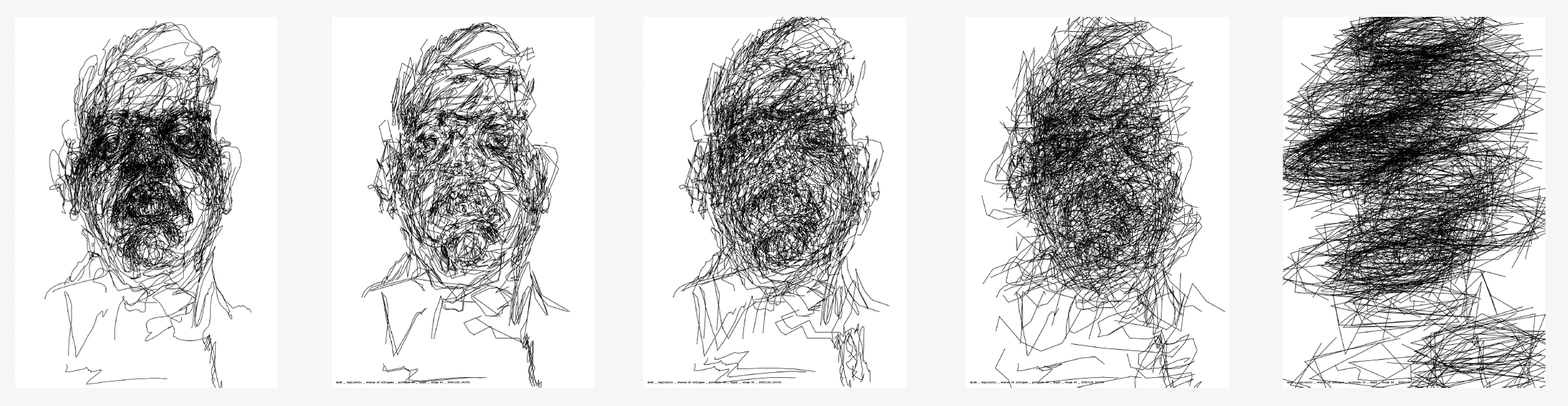 The protocol applies this taxonomy to the original drawings, generating transformed images through plotter-based re-drawing. Each condition leaves a specific pressure on the face. In some portraits, lines accumulate until the image almost disappears under its own abstraction; in others, slightly shifted versions of the same face stack like misregistered prints. Elsewhere, the drawing keeps only the contour and abandons the interior, or lets the figure thin out towards the blank page. Together, these variations map forces under which perception and relation are in dialogue.