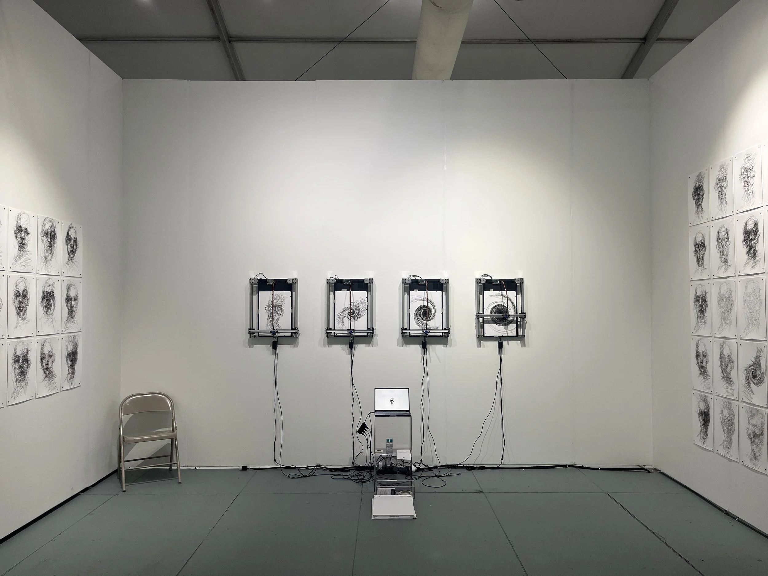 At the centre of the installation is a series of portraits hand-drawn from memory. The artist does not use photographs or screenshots. Each drawing begins with a real encounter, someone met, felt, and later recalled on paper. What appears is not a perfect likeness but a psychic imprint, how another person's presence has lodged itself in the artist. Imperfection is crucial. Tremors, hesitations, and excess in the line are not mistakes to be corrected; they are evidence that a human was involved, that emotion and motor control interacted in real time.